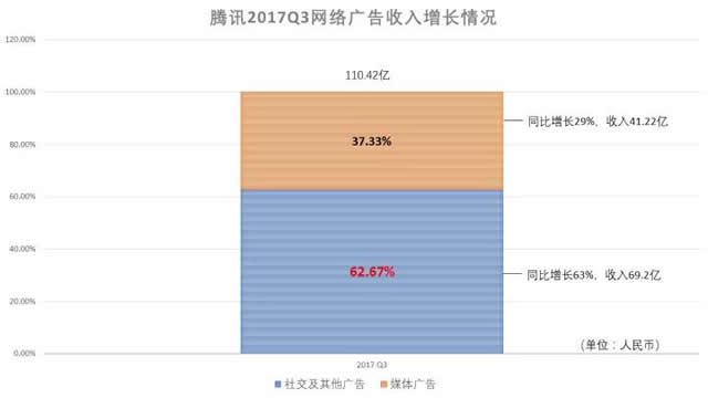 社交及其他广告收入同比增长63%至人民币69.20亿元,主要反映来自电商店铺的运营微信(主要是微信朋友圈及微信公众号)及其他移动端应用的广告收入增长。 ▼腾讯2017年Q3财报网络广告收入增长情况