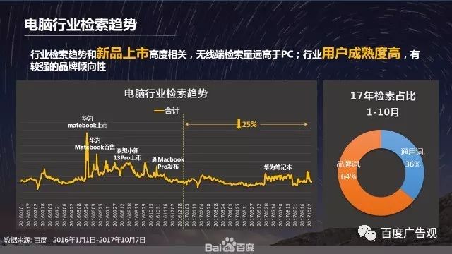 【PC行业发展现状】 从2012年开始一直到2016年,整个PC行业的市场表现一直呈下滑趋势。也正如此,你可能会听到一些“PC将死”的论调,确实,整体市场表现不佳是不争的事实,这个无可辩驳,但着实没必要太过悲观。下面我们就用百度的大数据来看一看行业现状,读完这篇文章后,你会发现实际情况并没有想象中那么糟糕。游戏本、商务本的快速成长,将成为未来带动整个PC行业前行的引擎。 从行业整体检索趋势来看,17年华为入局PC,拉动了整体行业的检索趋势,但18年新品上市力度较小,同比检索量下滑25%。同时,作为成熟行业,PC用户认知度整体偏高,品牌词检索占比达到64%(对标新兴行业-智能机器人,品牌词占比只有30%)。大部分的消费者都会直接查找中意的品牌。这也给各大品牌主带来莫大的安慰,你们的广告费没白花,用户的品牌倾向性还是很高的。