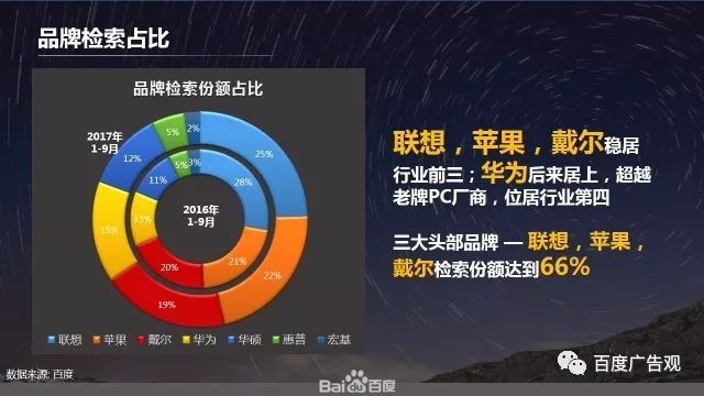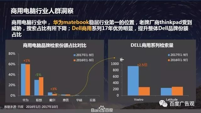 商用电脑 说到商用电脑,不得不提的就是华为,华为利用本身的品牌优势,将在智能手机领域积累的极度成熟的工艺设计力和科技创新力入局PC,打造了时尚新商务的Matebook,一入市直接稳居行业第一(用户检索量,非销售数据)。联想Thinkpad检索量同比下降5%。DellVostro 17年宣传力度加大,品牌检索量大幅提升,从而拉动了dell商用系列的检索占比。