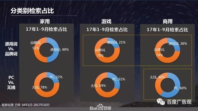 下面我们就看一下这三大类笔记本的人群差异,从品牌认知度来看,游戏和商用人群是最专业的两类人,他们很清楚的知道自己的需求点是什么,所以一上来就会搜索品牌相关的关键词。从人群分布来看,商用人群较家用和游戏相比,明显倾向于PC端。