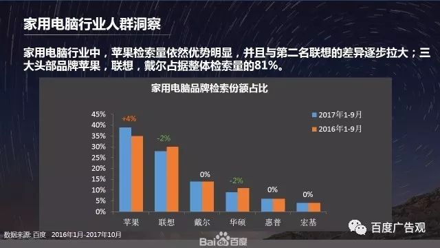 接下来我们根据不同的笔记本类型,看一下不同领域的发展情况: 家用电脑 家用电脑行业中,苹果检索量依然优势明显,各大品牌份额没有太大波动。
