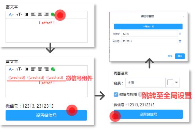 在表单编辑区可选择【表单单选】 目前表单单选项有两种样式,具体样式可以在编辑区自行选择~偷偷告诉大家,表单套装还有新的样式正在开发中呢o(* ̄▽ ̄*)ブ 微信号轮播 在之前的调研中我们发现有很多广告主需要同时推广多个微信号,但是对微信号组件一个个编辑显然是非常没有效率的,针对这个需求【灵动·落地页】在此次更新中新增了【微信号轮播】功能。PS:使用这项功能首先要在【全局设置】中选中【微信号轮播】才可以哦~具体的功能阐述如下: 富文本可添加微信号组件 新版本上线后可以在富文本编辑区里看到一个微信的符号,点击这个符号就会看见富文本中出现了微信号组件,每点击一次生成一个微信号组件。如果想要修改微信号组件,点击下方的“微信号设置”,编辑页面会自动跳转到【全局设置】,选中【微信号轮播】就可以设置微信号啦。
