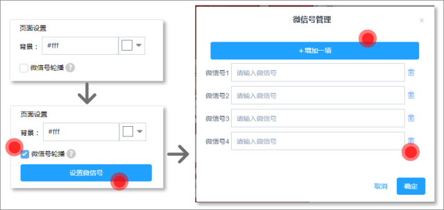 所有微信号可一键编辑 在【全局设置】中有可以看到【微信号轮播】选项。选中,点击【设置微信号】,即可在弹出的小窗里进行编辑。默认一次可添加四个微信号,广告主爸爸们也可以手动添加或删除微信号数目。在全局设置编辑后,微信号按钮与富文本中的微信号组件都会随之改变,无需手动一个个编辑,灰常滴方便。
