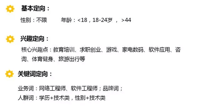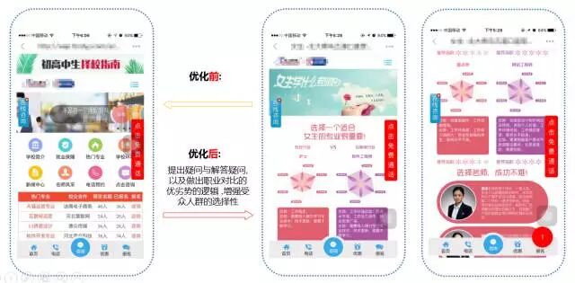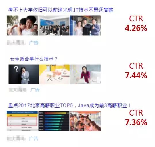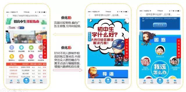 受众人群 受众人群特点 学历低过早辍学 希望通过自己掌握一门好的技能 来面对以后社会生活 受众人群特点 大学生,叫迷茫,对未来期望较高 期望从事一个前景较好的行业 转行白领,工作遇到瓶颈 希望掌握一门高薪技术来保证以后生活 受众人群特点 孩子过早不念书 希望给孩子找一个有发展的技术类学校学习 保证孩子以后的发展 从受众人群特征分析来看,初/高中毕业生、大学生&转行白领、60/70后孩子家长为主要消费群体,他们对IT教育最感兴趣。 优化秘籍 “创意优化 ” 优化前 优化前的创意存在以下三大问题 文案内容过硬,完全搬照大搜创意文案进行推广 图片完全一致,图片类型过于单一 导致创意的展现量与点击率均很低 优化后 优化创意秘籍解读 文案 热点文案要抓住人群痛点,提升点击率。 解惑类型的文案,简单粗暴直击潜在受众内心,引起首重的好奇且求解的心理。 新闻描述性文案,提升描述的真实性,吸引用户的关心,提升点击率。 配图 通过热点话题强调行业优势,整体与文案紧密相连,叙述性较强使人感同身受。 图片与文案内容相匹配,烘托出疑问的心理,增强创意内容的画面感,提升点击率。 图片配合相关的新闻数据图,以及招聘实景图,增强整体创意的新闻感,提升CTR。 落地页 落地页质量不佳? 高手都知道,针对受众定制落地页! 给初中生看的页面 初中生的心理水平尚处于从幼稚向成熟发展的过渡时期,这个时期他们的身心就处在一种非平衡状态,引起种种心理发展上的矛盾。 抓住这个特点,根据初中生的需求点,以解惑的形式进行落地页的编辑排版,增强兴趣感和信任度。