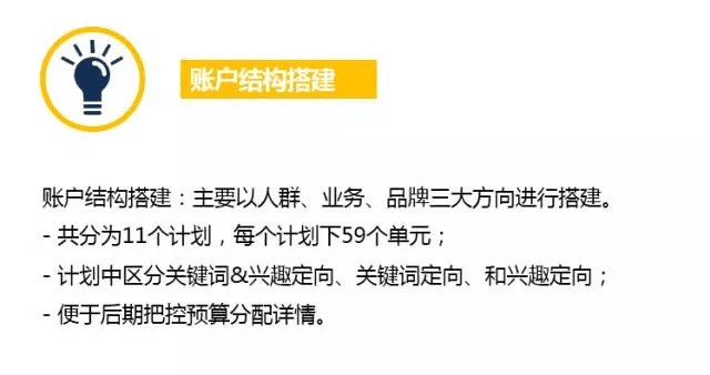 企业简介 客户公司位于首都北京。自成立以来发展迅速,公司业务不断发展壮大。具备专业的销售和技术团队,是北京IT教育行业内知名企业。 受众人群 人群受众主要分为三类: - 初/高中毕业生 - 大学生&转行白领 - 60/70后孩子家长 后期根据不同课程相对应的不同人群进行投放。 推广现状 待解决问题: 账户结构、投放精准度、落地页质量优化 期望结果: 降低推广转化成本,提升转化 · 问题分析 账户结构 “ 问题现状 ” 账户结构单一:创意数量太少。 广告投放为手百端通投,未进行定向选择。锁定投放人群流量不精准。 落地页质量不佳,内容过于广告主化。一味展现自己的课程与优势,吸引力不强,无明显逻辑性且与创意内容相关性差。 “ 解决方案 ” 账户结构搭建:主要以人群、业务、品牌三大方向进行账户搭建。计划中区分关键词&兴趣定向、关键词、兴趣定向,便于后期把控预算分配详情。 精准定向选择:基本定向、兴趣定向、关键词定向。精准锁定投放人群流量。 针对不同人群制作相应的独立落地页。落地页内容突出众人群的痛点与需求点进行编辑排版,增强兴趣感和信任度。
