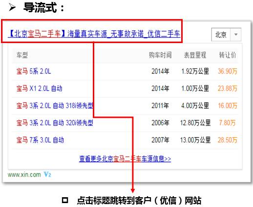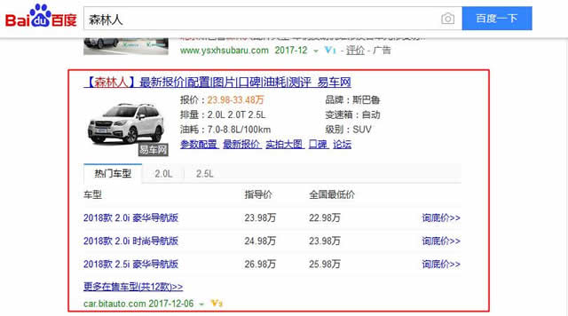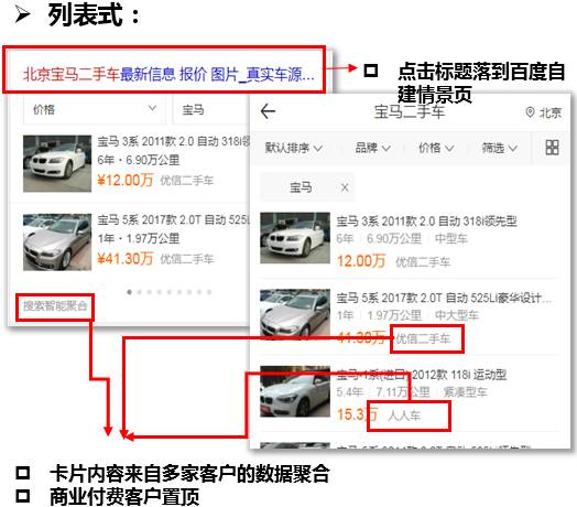 商业阿拉丁和普通搜索结果的区别 ▌样式上的区别:即普通搜索结果他的展现样式比较单一和标准化,而商业阿拉丁是可以从客户那里获取优质数据,进而可以便利地在搜索结果中展现用户体验更好的图文形态,从而吸引网民眼球。 ▌触发机制:全品类词触发,精确匹配,CPC计费 1、通用词:SUV,SUV怎么样 2、品牌词:大众SUV,大众SUV性价比 3、具体产品词:途观2016款1.8t豪华版油耗 产品亮点 ▌1.求化整合词包触发海量流量,覆盖用户消费决策全路径。 a.通用词:SUV,SUV怎么样;——【覆盖用户产品购买兴趣和动机阶段】 b.品牌词:大众SUV,大众SUV性价比——【覆盖用户研究比较阶段】 ▌2.百度自然搜索结果"内容化"展现 a.自然结果的1~10位。 b.更接近于用户搜索内容。更容易引导用户阅读、点击。 c.行业定制化样式。 d.上线前经过严格审核,内容要求满足用户体验。 ▌3.用户场景“原生化”展现 阿拉丁位于自然搜索结果信息流中,表现样式原生、对网民搜索的需求满足度原生。