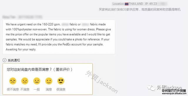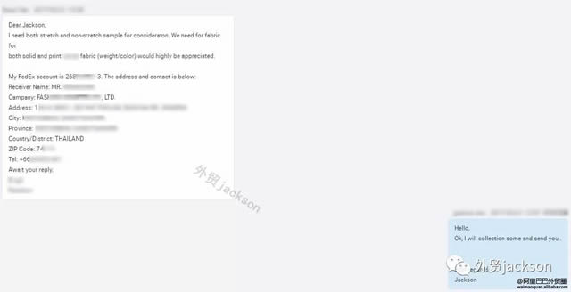 我看到的第一反应就是我们可能做不了,要的是non-woven无纺布材质,我们没有这个材质的面料。此外看到这样的询盘,发现已经发送给了20家供应商同样的内容,而且一开始就主动抛出他会给我们提供FedEx账号,看来是收集做衣服的面料灵感的。看到这里很多人开始不相信了,一个订单客户给20家都提供到付账号那得多少钱啊,算200块一个那就是4000块,这才收样品的钱,还要打样给客户寄样,一个订单光是快递客户花好几万,于是就觉得这是假的,为何他花费那么多不直接到展会上去。很多人也看到我之前的文章说我花几万寄样也是假的一样的道理。 什么大风大浪没见过,虽然这个人可能先收集到样品灵感,之后可能把选中的面料再发给其他供应商,但是既然客户提供到付账号,那么何不试一试呢,而且感觉这个客户虽然要的不是我们材质的面料,但是我们有面料适合Women dress,于是我就回了,根据他的描述我认真推荐了他几个产品。结果客户直接就发来了他的要求,我推荐给他的面料都要。经验的积累很重要,会主动推荐的业务员才是好的业务员,不是说客户要的产品跟你们产品完全匹配才能够卖给他们,而这需要大量的询盘可以加入外贸jackson vip群快速学习提升询盘,并有正确的积累方法积累。往往主动推荐的才能卖出去,卖上价。 推荐的非常准确,之后他给了我地址,我回复很简单,I will collection some and send to you.