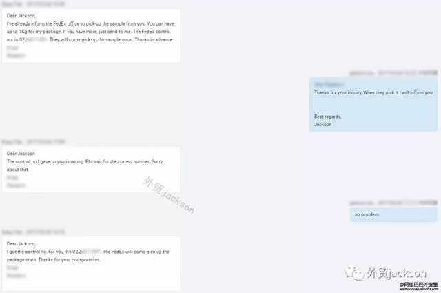 当天下午快下班的时候FedEx就打电话过来和我确认,核对了信息,说信息正确,明天来取。这里之后客户又发来说他的control no错误了,给我更正,过了半小时FedEx给我果然又打电话过来了。