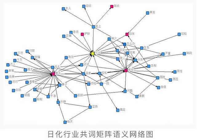 第一步,找到高频词的特性和词与词之间的关系,从而确定标题的突破口和方向。 比如日化行业的语义网络分析结果: