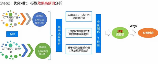 以上A/B测试中,标题完全相同,但是图片A偏原生,没有任何利益点说明;而图片B有利益点标签,从最终的CTR值可以发现,偏原生图片效果更佳。 A/B测验虽然结果真实而直观,但是A/B测验也有自己的局限性: a. 需考虑覆盖的用户量和用户相似性:用户量太小和用户差异性太大,结论待商榷。 b. 结论的复用需谨慎:因为测试过程控制了很多因素,比如说广告形式、广告位或定向人群等,结论可能受制于这些因素的影响,应用范围较小。 那既然已经投放了很多的广告,是否可以利用历史广告数据来寻找规律呢?这里再跟大家简单介绍一种分析方法_词频语义分析。 02、词频语义分析 词频语义分析并不需要你从最底层的模型和算法去着手了解,现在市面上的中文词频分析工具已经比较成熟了,我们可以再此基础上进行分析。 这里堂主简单跟大家介绍一下我们创优堂以往对标题优化的分析思路: