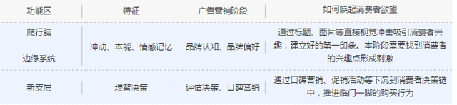 爬行脑——原始大脑,控制人的望和本能,也掌管着人类大部分的决策。它是愚蠢、冲动、缺乏远见并渴望立刻满足的。 边缘系统——情感大脑,控制人的情绪、情感和长期记忆,它是情绪化的。 新皮层——理性大脑,包括左右两个脑半球,控制思维、逻辑、语言、想象力等所有的“高级”功能。 这几个脑是同时独立运行的,但是爬行脑和边缘系统控制了大部分的日常决策,特别是一些需要临时马上做的决策,或感性决策。就像在众多创意中选择一个点击,这种决策就是由爬行脑和边缘系统共同决定的。 下表是不同大脑功能区对应到广告营销中的阶段和说明