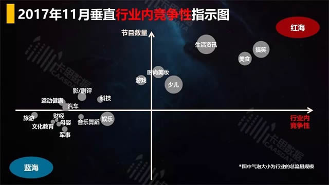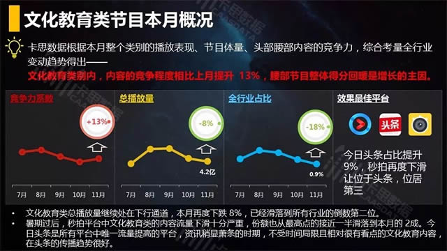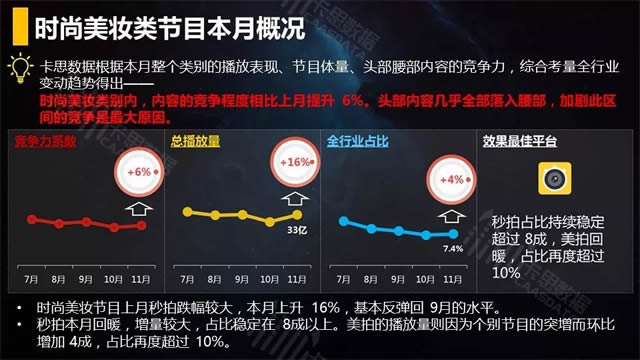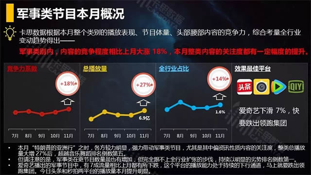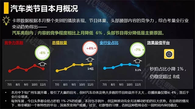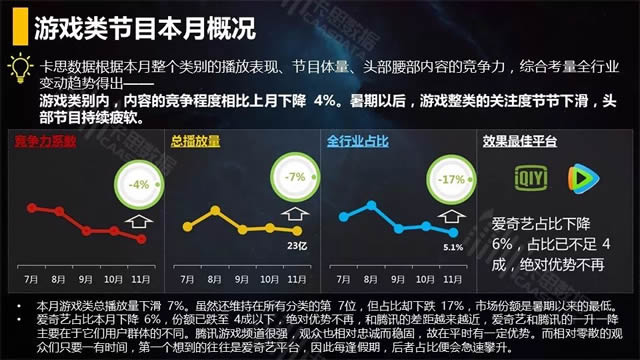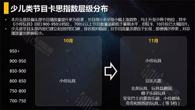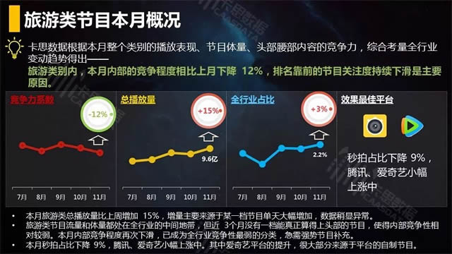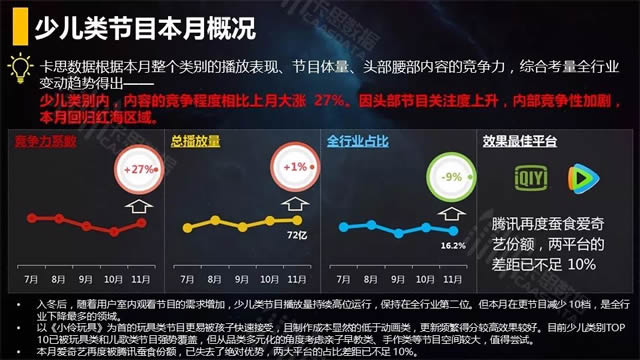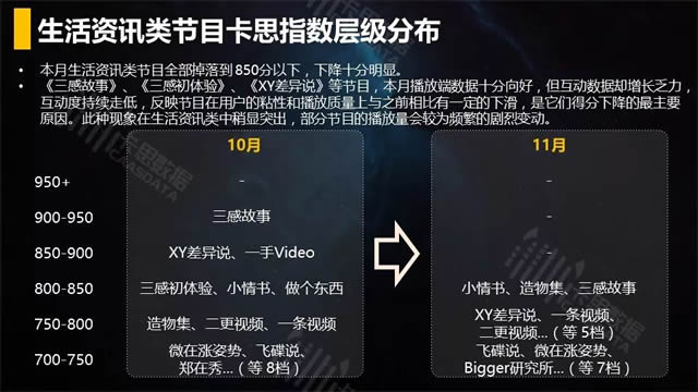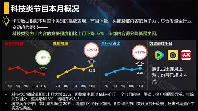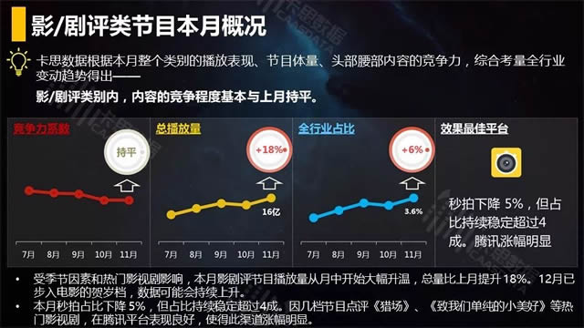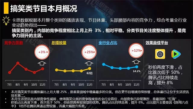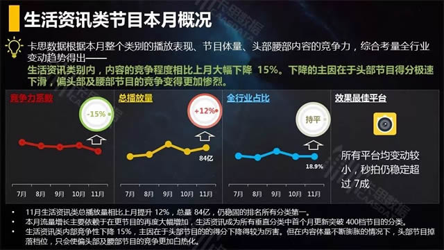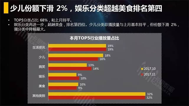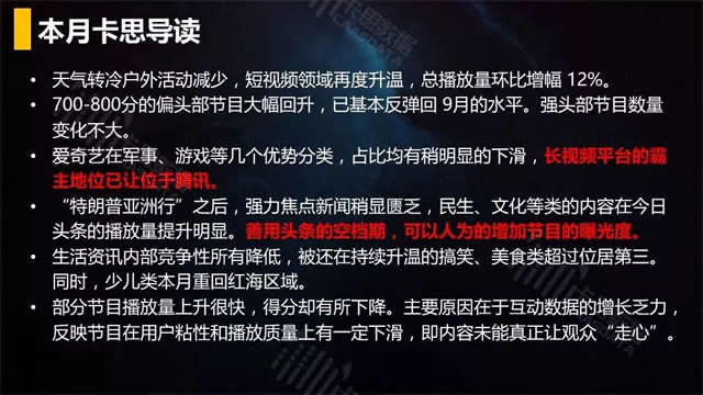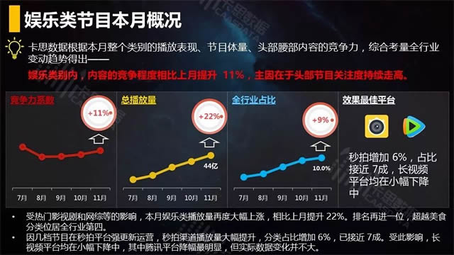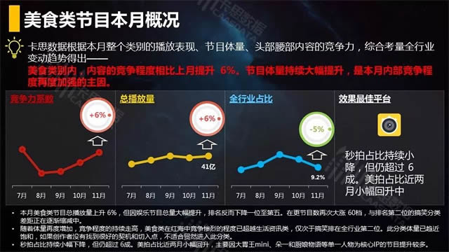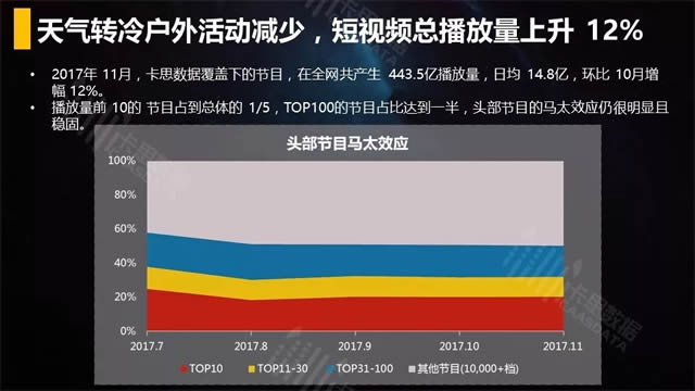 1、2017年 11月,卡思数据覆盖下的节目,在全网共产生 443.5亿播放量,日均 14.8亿,环比增长 12% 。天气转冷,户外活动减少,室内观看需求增加。头部节目的马太效应仍然明显,总榜TOP10节目的播放量占到总体的1/5。 2、900分以上强头部节目基本稳定,700-800分偏头部节目大幅提升,基本反弹回 9月水平。弱分类的形势有所缓解,但旅游仍无 700+。企业危机公关的例子短视频平台的份额缓慢扩张,长视频平台中腾讯重回霸主。 3、少儿类头部、偏头部节目播放量提升明显,得分多呈小幅上涨趋势,均上升至少两个档位。内部竞争性加剧,竞争力上涨 27%,本月回归红海领域。在更节目减少 10档,但该分类长尾效应明显网络营销整合,停更对总量影响小。 4、生活资讯类总播放量上升 12%,达 84亿。头部节目得分极速下滑,偏头部及腰部节目竞争更加惨烈。所有节目掉落到 850分以下,其中《三感故事》《三感初体验》《XY差异说》播放量强势但互动持续走低。 5、搞笑类播放量大增 25%,是增量最多的分类,但在更节目增速放缓,总体量让位于生活资讯排名第二。竞争力提升 3%,内部竞争异常激烈,是最深的“红海”。头部及偏头部节目关注度大增,《陈翔六点半》重回 950分以上档位。