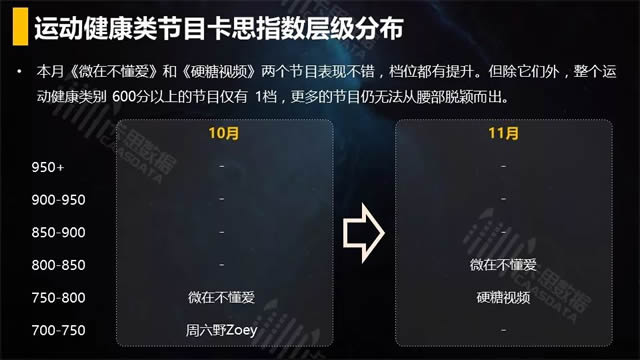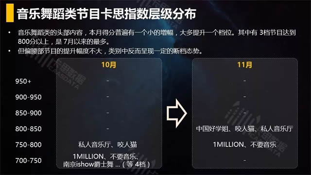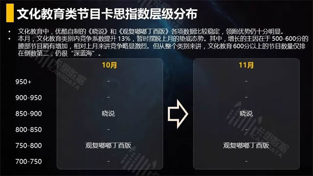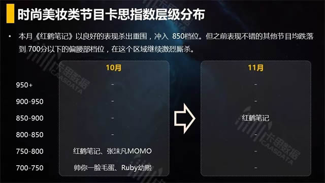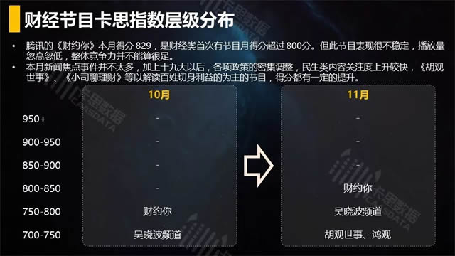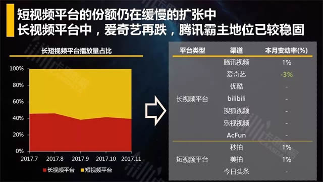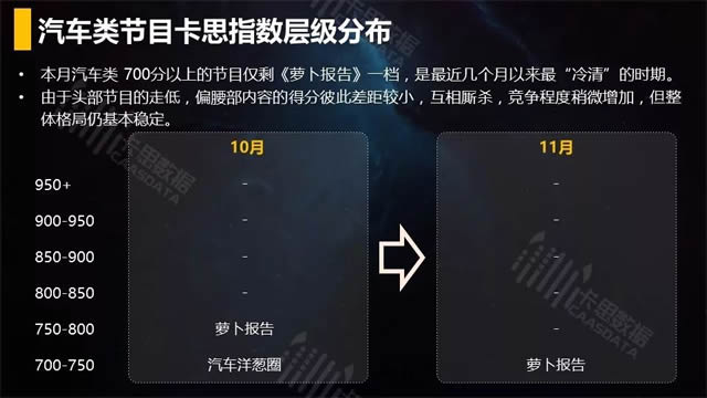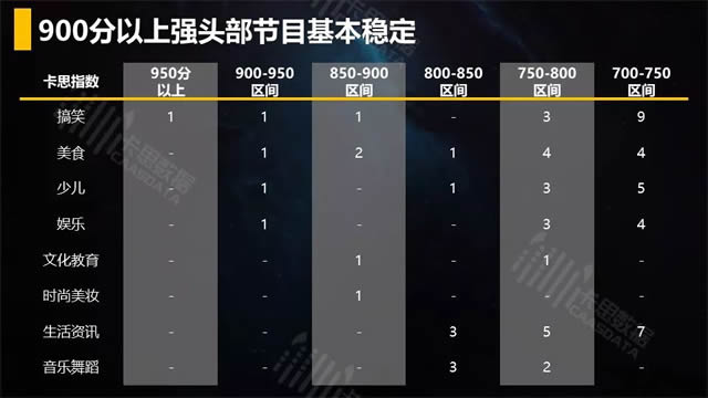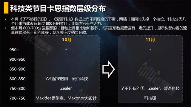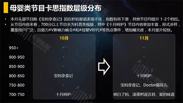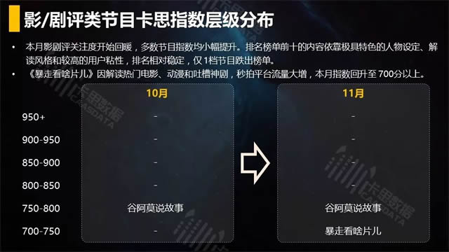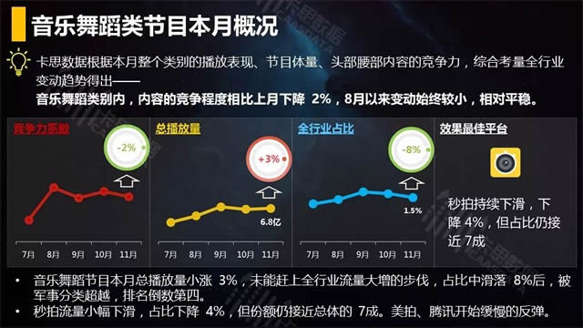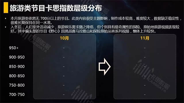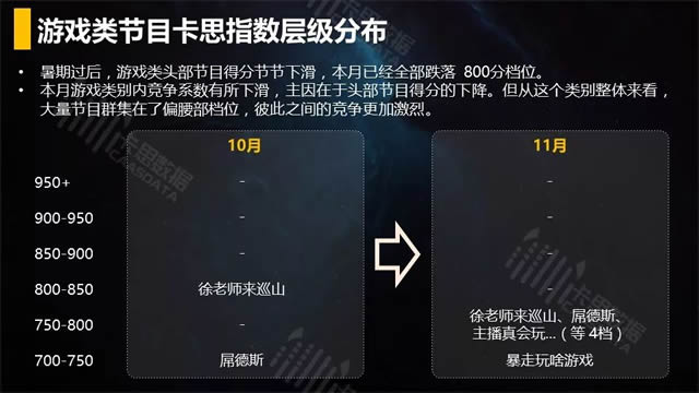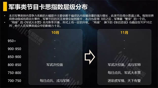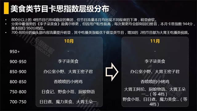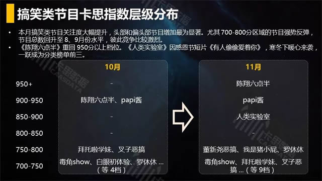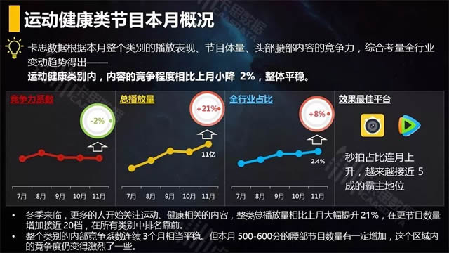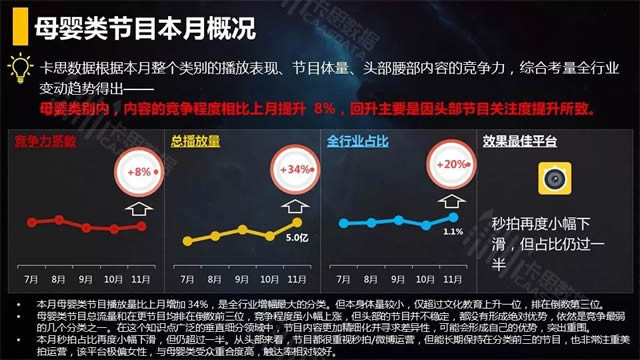 1、2017年 11月,卡思数据覆盖下的节目,在全网共产生 443.5亿播放量,日均 14.8亿,环比增长 12% 。天气转冷,户外活动减少,室内观看需求增加。头部节目的马太效应仍然明显,总榜TOP10节目的播放量占到总体的1/5。 2、900分以上强头部节目基本稳定,700-800分偏头部节目大幅提升,基本反弹回 9月水平。弱分类的形势有所缓解,但旅游仍无 700+。企业危机公关的例子短视频平台的份额缓慢扩张,长视频平台中腾讯重回霸主。 3、少儿类头部、偏头部节目播放量提升明显,得分多呈小幅上涨趋势,均上升至少两个档位。内部竞争性加剧,竞争力上涨 27%,本月回归红海领域。在更节目减少 10档,但该分类长尾效应明显网络营销整合,停更对总量影响小。 4、生活资讯类总播放量上升 12%,达 84亿。头部节目得分极速下滑,偏头部及腰部节目竞争更加惨烈。所有节目掉落到 850分以下,其中《三感故事》《三感初体验》《XY差异说》播放量强势但互动持续走低。 5、搞笑类播放量大增 25%,是增量最多的分类,但在更节目增速放缓,总体量让位于生活资讯排名第二。竞争力提升 3%,内部竞争异常激烈,是最深的“红海”。头部及偏头部节目关注度大增,《陈翔六点半》重回 950分以上档位。