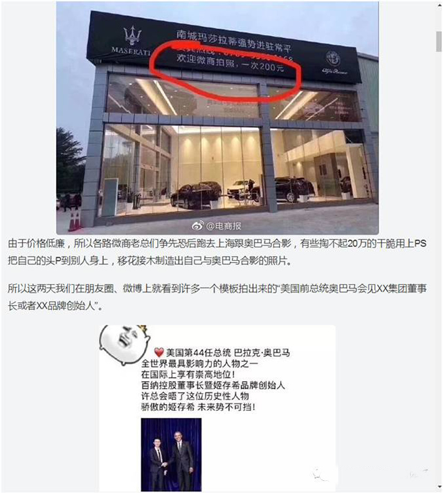 那这个图片是什么意思呢? 就是说我们很多微商,不是热衷于晒车晒房晒游艇吗?有这么一家洗车4S店,看到这是个商机,于是打出了“欢迎微商拍照,一次200元“的广告。 瞧,你花200元,就可以和豪车拍照,那你就可以在朋友圈晒豪车了不是。 所以你知道,为什么那些微商,都前仆后继的要晒车晒房晒游艇呢?这就是预置,意思就是告诉你,你看我活的多么潇洒、富有。所以你羡慕我,那么你要不要和我一起做微商呢?要不要做我的下级代理呢? 这就是预置。 我们再来看看“奥巴马:可怜美帝前总统,沦落中国陪微商!”这篇新闻报道中是怎么报道的,且看下图中的文字:
