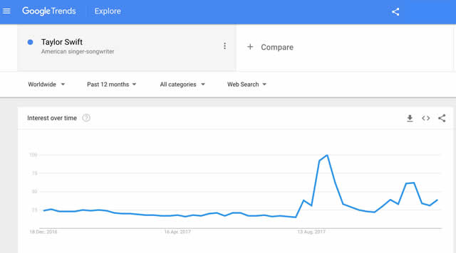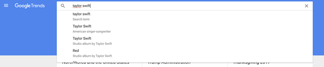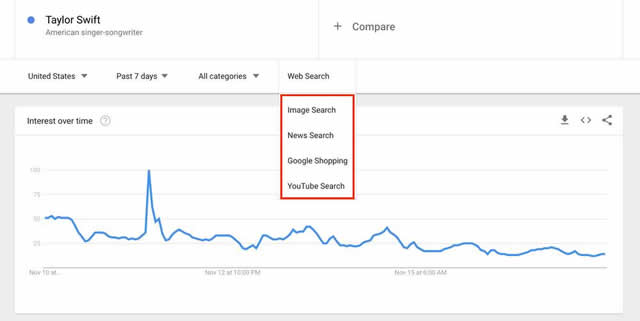 做搜索广告的AdWords客户对Google Trends这个工具一定不陌生。我们为搜索广告系寻找关键字灵感的时候,除了使用AdWords自带的关键字规划师,Google Trends也是超实用的拓词工具。 什么是Google Trends? Google Trends提营销策划的主要内容供世界各地用户的实时搜索数据,并利用清晰、多彩的图表让关键的洞察一目了然。无论是对于做研究圣经里关于危机公关的学生、媒体记者或者广告主,Google Trends都是一个必不可少的工具。 产品更新:现已提供谷歌购物、YouTube搜索数据 近期Google官方博客宣布,Google Trends开放了更多实时数据,为用户提供更全面的参考。现在起,您可以在Google Trends上查找到Google新闻搜索、购物搜索、图片搜索和YouTube上的热搜趋势。 如何使用Google Trends? 使用Google Trends非常简单。小编就用Taylor Swift(泰勒·斯威夫特)作为搜索词给大家举个例子吧! 首先,在顶部搜索条输入一个关键字。