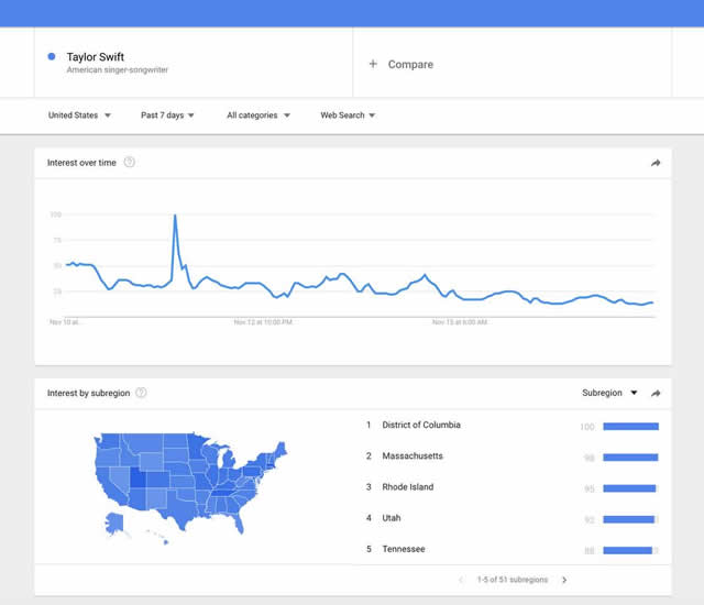 现在,我们将时间范围调整为过去七天,把地理区域选项锁定在“美国”。如下图所示,我们可以看到过去一周全美“Taylor Swift”这一词的搜索量曲线,以及各个州搜索热度排行榜。