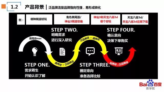 泛品牌词商机巨大 那么什么是泛品牌词 是指除核心品牌词外,所有包含品牌名的拓展词,如品牌+产品名或品牌+服务名这种扩展品牌流量词。如:天龙八部3d新服、天龙八部3d和诛仙哪个好玩。 泛品牌词的流量怎么样,搜的人多不多,通过饼图可看到泛品牌词流量占比大于品专词达到54%,所以泛品牌流量蕴含着巨大商机和品牌价值。 在网民整个决策周期中,泛品牌词贯穿在明确需求,选择比较和最终确定需求几个环节,而且随着了解的深入,泛品牌词的品牌指向性逐渐增强,更易形成转化,所以企业应该抓住这部分流量。