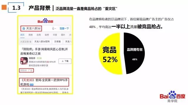 通过百度的数据显示,首位广告经常被竞品抢占,就像左侧展示的案例,网民搜索天龙八部3d,首位被竞品阴阳师抢占,天龙八部广告只能屈居其下。