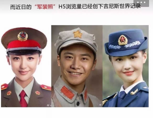 吴伯凡曾在《时间的朋友》跨年演讲上分享: "用户不再会为柴米油盐酱醋茶的‘茶’付钱,但会为琴棋书画诗酒茶的‘茶’买单,茶的故事和意义已经超越喝茶的本质需求。" "喜茶"的排队现象体现了网红经济下消费者的情感诉求,消费者对于产品的好奇,从而产生跟风消费;再利用社交工具进行分享,这是购买后超越消费本身的情感满足。 08、最接地气:全民军装照 2017年也是官媒拥抱社交媒体的一年,继两会召开时,继一支总理@你,"两会邀请你进群聊"的H5的疯狂刷屏,人们开始惊喜:“官媒也可以这么接地气?” 而之后八一建军节人民日报推出《快看呐!这是我的军装照》H5又创刷屏新高,最终浏览次数累计8.2亿,独立访客累计1.27亿,一分钟访问人数峰值高达41万,创下吉尼斯世界纪录。
