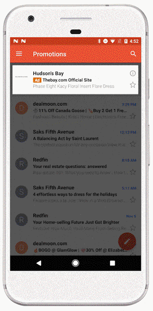 如图,光顾过女装网站的顾客,会在自己的收件箱中收到AdWords自动推送的促销信息,外观和风格与使用者一开始看到的Gmail收件箱一致,只要点一下广告,就可以展开广告并查看详情。