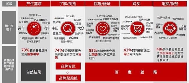 消费者决策五阶段 1、 当消费者产生购买需求时,绝大部分会选择通过搜索引擎来进行针对性的信息收集; 2、 根据所收集的信息,消费者将开始寻找满足自己需求的商品,其中,绝大部分会选择提前浏览各品牌的官网,了解品牌信息; 3、 当目标商品范围不断缩小后,消费者将进行最终的挑选和验证,其方式主要为通过网络研究产品细节以及通过社交媒体获取建议; 4、 接下来到了购买阶段,此时,线上便捷可靠的购买流程是用户获得良好体验的重要部分; 5、 最后,贴心的退换及服务是企业应当为消费者承担的终极责任。 通过分析消费者的购买决策行为过程,企业的品牌信息如果能在适当的阶段曝光展现,在用户摇摆不定的时候给予充分的信任条件,从而获得用户最关键的一票,不但能够完整品牌在用户各个思考阶段应有的角色,更能为产品的销售增量提速。