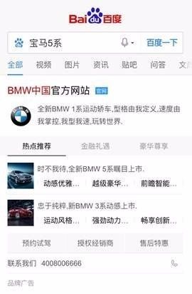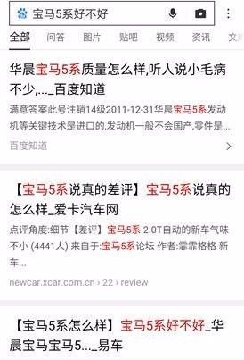 用户搜索“宝马5系”出现的品牌专区广告展现样式 然而,如果用户通过搜索品牌词+需求词,如“宝马5系好不好?”“宝马质量怎么样?”从而进行几个品牌的比较和挑选时,企业未能第一时间提供专业全面的信息,甚至,若出现恶意竞争,有关自身品牌的负面信息挤占了搜索结果页前端时,将会增加用户选择竞争对手的机会。 自然结果页 微商的引流方式