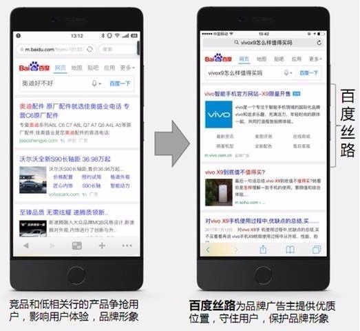 按耐不住一颗,来自普通网民,面对海量搜索结果,严重缺乏安全感的心,在此需要插一句话:当我问百度什么东西好不好的时候,我不希望我问到的品牌像如“杂牌子”一般出现,更加加剧我的不安感和选择困难症,如果此时我看到某个品牌挂着官网的标示,以专业的姿态“教育”我什么叫品牌,那一定是极好的。 百度丝路将为企业带来三方面的价值 价值一:流量和点击率的提升 1、 品牌需求词pv平均占品牌词pv的20%左右。 2、 根据测试数据,百度丝路的点击率最高约60%,且随着投放的时长增长,点击率有逐步提升趋势。