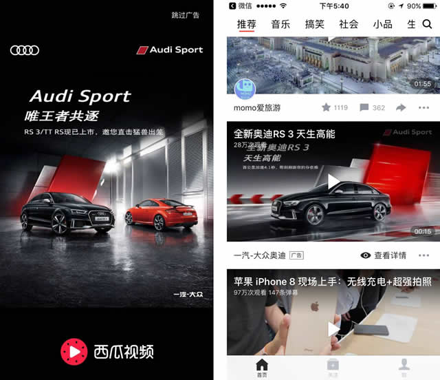 西瓜视频开启短视频营销新模式 不仅仅是极度原生,奥迪选择视频信息流投放更有头条技术实力支持!西瓜视频一问世,就自带今日头条智能分发和算法基因,拥有6大维度用户定向方式,220万个兴趣关键词,帮助视频信息流广告综合视频特征、人物特征、环境特征,进而精准定向目标人群,达成有效而深度的影响。创新形式与科学算法双重保障和加持,让奥迪此次投放预估毫无压力,最终获得效果翻倍增长的惊喜! 移动互联网时代,品牌需要拥有更敏锐的嗅觉和营销速度。年轻人喜欢的内容在变,年轻人的内容消费方式在变,品牌必须拥抱变化,不错过年轻一代的内容消费新焦点,方能占据营销高点,占领用户心智。 嗅觉和速度至关重要,奥迪在短视频最火爆的时候选择了最新鲜的营销方式在Audi Sport嘉年华这场潮流派时引爆年轻热情,实实在在为其高性能车又吸纳了不少热血粉丝。相信,有奥迪的此次尝试,西瓜视频这个以年轻、优质内容为核心的短视频平台,必将吸引到更多的品牌一起探索品牌年轻化的更好未来。
