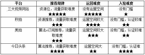 (1)秒拍仍然是流量最主要来源,在各个领域中占据50%以上的流量; (2)美拍作为以红人、尤其是女性为主角的节目中,流量也占据了非常重要的部分,大约占到1/4到1/3的流量; (3)传统三大视频网站在短视频节目中,流量只能作为配角,除了玩具领域之外,流量比例只占到了1/5以下; 玩具是一个比较特殊的垂直领域,节目中的流量几乎全部集中在三大视频网站,我们可以分析的是,这一类的观众主要是家长和儿童,而且会在闲散时间比较多的时候观看,故这一类的节目的时长一般也会较长。 (4)在一些以男性为主要特色的节目当中,比如科技类和军事类,流量分布比较平均,尤其像今日头条这样以男性用户为主的新兴短视频平台流量比重逐渐加大,占到30%~35%左右,而视频网站和秒拍的流量也会各占3成,以女性用户为主的美拍,则在这类节目中没有太多流量贡献。 2、纯靠内容获取平台流量越来越难 从推荐规律,运营难度以及入驻难度三个维度可以比较。