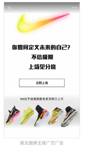 NIKE作为首发客户尝试了朋友圈原生推广页广告产品,以“你,不信极限”为主题,通过流媒体长视频,讲述普通人不断突破自我、挑战极限的体育精神。当用户点击外层图片后就进入原生推广页,全屏展示的无停顿特色长图从苏炳添到内马尔一刷到底,搭载极速加载的原生广告技术,给用户以极致沉浸式体验。结尾支持跳转NIKE官网直接购买奥运明星同款跑鞋,帮助NIKE有效传递品牌精神的同时,促进销售转化。