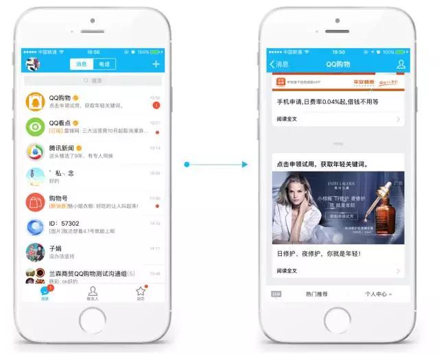 l 大数据画像强触达 基于QQ用户数据,结合腾讯系社交、支付、搜索、娱乐等多场景数据,京东购物数据以及第三方合作伙伴数据,通过深度数据挖掘,可以在海量数据中定位八大精准人群,让每一次触达更加精准高效,从而降低成本。 l 交互闭环直接转化 基于手Q平台,购物号消息广告提供品牌落地页和电商自定义落地页两种标的推广,用户点击广告可跳转至品牌购物号,提升粉丝数量,或者直接跳转到电商购买页面,促进下单购买。从推广到转化在手Q平台内一次完成,交互式营销闭环有效提升转化率。 而且,普通广告只提供1小时内的点击数据监测,而购物号消息广告针对点击转化效果的数据监测时间长达24小时,使广告主能够更好地了解广告投放效果,从而进行优化。 l 支持多种展现形式 购物号消息广告支持单图文、多图文及视频多种广告展现形式,广告主可以根据营销需求进行选择。以品牌推广为主要目标的客户可以选择单图文广告,突出品牌信息,而电商效果类客户则可以选择多图文广告,每条素材匹配不同的落地页,更方便展示产品,促进销售。 自上线以来,购物号消息广告已帮助许多不同行业的广告主达成了营销目标,无论是品牌曝光,还是促进转化都有出色表现,提升ROI方面成绩十分亮眼。 雅诗兰黛:品效合一成本低,数据沉淀助优化 雅诗兰黛投放购物号消息广告,推广明星产品“小棕瓶”。以免费试用装为利益点吸引用户点击广告,并跳转至H5活动页填写表单申领。 通过对品牌目标消费群的画像梳理,并对人群在QQ的行为做深度分析洞察,匹配相应的目标用户进行投放,精准的数据挖掘和触达有效助力线下领取活动的火爆进行。
