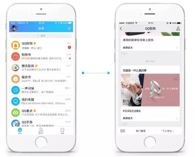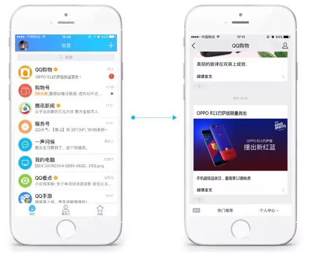 手机QQ推出购物号消息广告产品,即以类QQ消息的形式将广告推送给用户。只要关注了“QQ购物”公众号的用户,都可以收到推送,可以有效覆盖具有购物兴趣、购物意愿的用户,提高曝光有效率,同时避免了对其他用户的打扰。