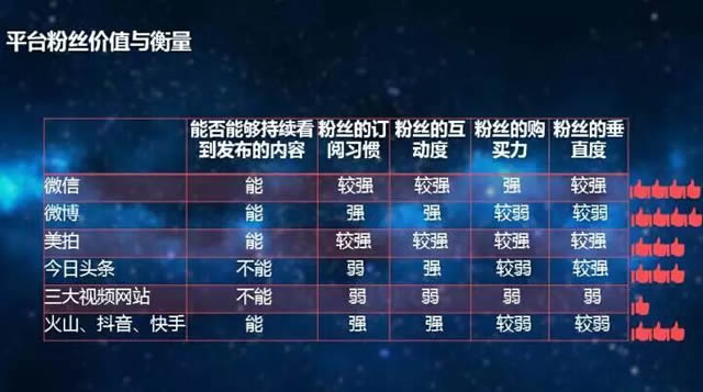 上节课《短视频流量从0到1亿,你只需学会这三步》我们提到了如何快速获得流量,获得流量除了能够获得补贴,提高节目的影响力之外,还有一个非常重要的功能:沉淀粉丝。 时长约1小时,若不方便可直接看文章 短视频平台粉丝价值及获取难度 流量并不一定能够直接获得粉丝,每个平台流量获取粉丝都会有一定的比例,即获得的总粉丝数/每万次播放,这个数值越大,说明平台的流量对于获取粉丝越容易。 影响各平台获取粉丝难度的因素: 1.每万次流量关注量。各个平台数值大致如下: 2.平台关注按钮位置。一般来说,UGC短视频平台关注按钮最人性化,也最容易诱导用户点击,一些平台在内容播放过程中,会在屏幕上去引导用户去关注,比如美拍、UGC平台等。 3.平台粉丝获取成本。各个平台因为价值不同,粉丝获取成本也大不相同。 今日头条:0 微博:0.5~1块 微信:8~10块 企鹅、大鱼号、一点资讯、百家号:0 美拍:N/A 三大视频网站:N/A 抖音、火山、快手:N/A (备注:N/A :数据有限,暂未统计) 全网拥有100万的粉丝里,哪些平台的粉丝最具价值呢? 粉丝获取的难易程度(关注率和关注成本),并不完全决定平台的粉丝价值。比如在粉丝获取的难易程度上,UGC平台<美拍<双微<今日头条<大鱼号、百家号<三大视频网站,并不能说明三大视频网站粉丝价值就大于UGC平台(火山,快手,抖音) 因此,衡量粉丝价值有几个维度: 1.能否能够持续看到发布的内容。这与平台推荐逻辑紧密相关,一般来说,订阅逻辑下的粉丝价值要大于算法推荐和资源推荐。比如:微博、微信、美拍粉丝价值大于今日头条等算法平台,也要大于视频网站、秒拍等资源推荐平台。PS:新版微博的粉丝加大了内容的算法推荐逻辑,即微博正在头条化。 举个例子:今日头条上有个功能叫做粉丝阅读(播放),这个数值是极低的。这就说明,一般来说粉丝关注一个自媒体,是关注其中的内容,如果不能持续更新同类同质量的内容,他可能接下来很长时间都不会再看这个自媒体发布的内容。 2.粉丝的订阅习惯。粉丝的订阅习惯取决于两个因素:第一,在平台看内容的习惯;第二,粉丝的粘性。究竟是喜欢你的内容还是生产内容的人。 (1)粉丝在各个平台的阅读习惯是不同的。在今日头条等算法平台上,主要的目的是获取资讯,而并不关心谁是资讯的提供者,这就决定了用户因为某个内容订阅某个节目,用户接下来并不一定会成为这个节目的粉丝。而在微博、微信等平台上,用户是因为喜欢某个内容,而会持续追看生产内容的创作者,或者说节目。 (2)粉丝喜欢内容还是喜欢生产内容的“人”决定了粉丝的粘性。一般来说,用户关注“人”的诉求要大于“内容”。首先,人与人之间有天然的连接性,这种连接有情感连接,价值观连接,社交连接等;其次,用户关注“人”的时间的持续性更长。最后,关注“人”比关注“内容”更容易对用户产生信任感,而信任感是变现的基础。 举例,明星的粉丝粘性最大,以至于明星生产什么内容,粉丝都会追着看;反之,则不成立。 因此在今日头条这一类的平台,用户更关心的内容,不容易跟内容生产者产生连接,而今日头条极弱的社交属性,也决定了订阅用户本身价值是比较低的。 3.粉丝的互动度。平台粉丝的互动度,取决于三个因素:一是平台用户的平均使用时长;二是平台社交属性强弱;三是平台内容的独家性强弱。 在内容同质化的情形下,用户在一个平台使用时间越长,那么互动的可能性就越大。因为一个用户在各个平台的总时长是一定的,在一个平台使用时间越长,那么在另一个平台使用时间必然会降低(本质上是争夺用户的注意力时间) 平台的社交属性也决定用户的互动度,比如微博和微信会给内容生产者与用户,用户与用户提供社交的空间,所以这两个平台互动率是最好的。 平台内容的独家性也会决定粉丝的互动度。这里最典型的例子就是B站和内涵段子,因为内容的特殊性,会吸引一批小众粉丝持续跟随,而且互动性极高。 那什么样情况下,粉丝最爱互动?1.内容的话题性(如争议性话题);2.内容的价值引导(如能否引起共鸣);3.内容的有趣性(比如是否够八卦)。 微信的粉丝最鸡汤,微博的粉丝最爱吵,头条的粉丝最爱喷,企鹅平台的粉丝最爱写。 4.粉丝的购买力。粉丝的购买力决定于平台用户画像。微信的用户,普遍是“三高(高学历、高收入、高职位)”,所以在微信上的用户购买力是远远高于其他内容平台。 5.粉丝的垂直度。平台的粉丝越垂直,对于相关行业的广告主吸引力越大,从而用户的价值越大。比如美拍对于美妆、美食等女性行业的广告主吸引力就非常大,再比如母婴行业类的内容平台,如宝宝树。为什么现在的广告客户越来看中今日头条?最重要的原因,就是今日头条的大数据算法可以准确帮助广告主找到目标用户(地域精确、兴趣精确、年龄精确)