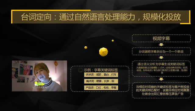 值得一提的是,基于内容定向的广告投放,为了减轻投放的人力和时间成本,规模化是关键。目前,搜狐已经具备领先的自然语言处理能力、图像处理能力,而通过这些能力实现了规模化、自动化、系统化的文章定向、台词定向、视频画像定向投放。