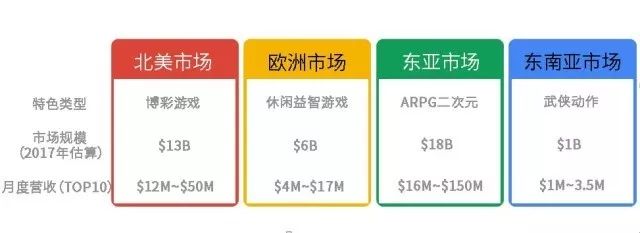 那么怎样选择适合自己的海外市场呢?不同的游戏类型适合投放在不同的广告市场,比如东亚市场是ARPG和二次元、欧洲市场是休闲益智游戏、北美市场比较喜欢博彩游戏,快对照下自己的游戏类型“投其所好”吧。