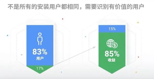 17%的手游用户贡献了超过85%的游戏收益,这部分就是我们需要寻找的高质量用户 Google小贴士 UAC 使用机器学习技术精准定位高品质目标;机器学习技术能够实时分析超过3亿个潜在信号组合,深度了解使用者行为。比如用户在什么时间浏览了什么网站,Google Play上下载了哪些App,YouTube上喜爱看哪些类型的影片等,机器会根据这些特征去找到其他玩家。这种方式不会遗漏真正对游戏感兴趣的人群。