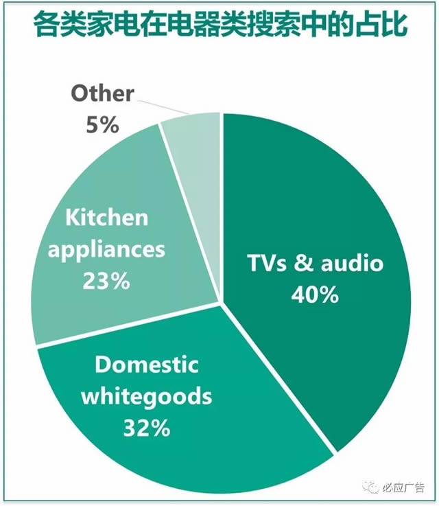 2015-2016 年,澳大利亚各家电小类在电器类搜索中的占比 承担家庭休闲娱乐重任的电视影音类电器,在澳大利亚电器类搜索中的占比高达 40%;解放生产力的大型家用电器以 32% 的占比居搜索热度第二位;另有 23% 的搜索发生在厨用电器上;“Other”中则包括吸尘器、电熨斗等小型家电。虽然电视影音类电器优势明显,但从数据上看,可以说大型家用电器、厨房电器都创造了很可观的市场,与 TV & audio 三分天下。