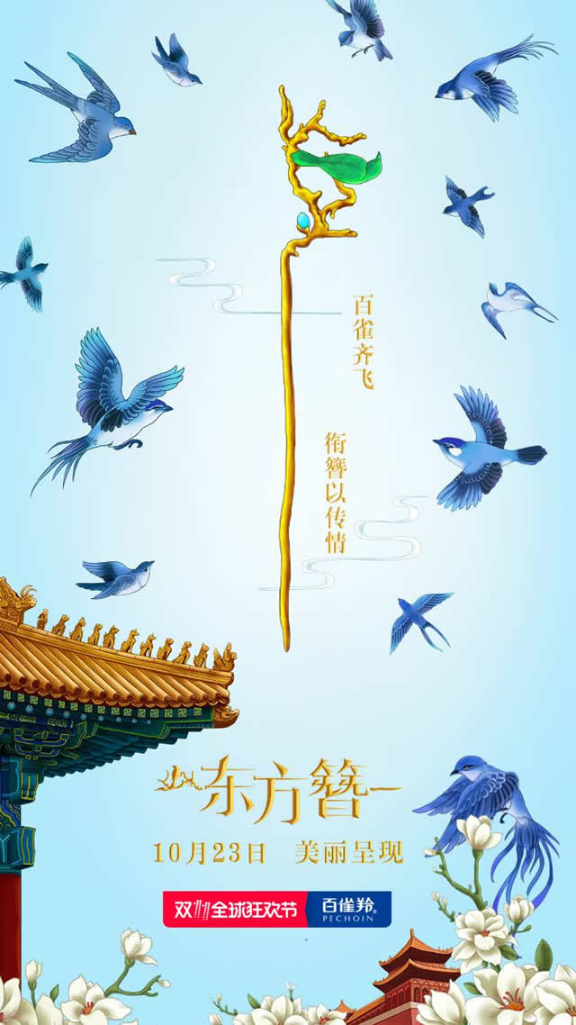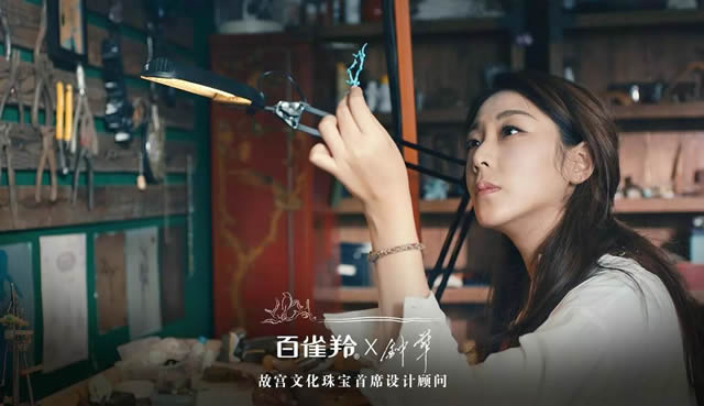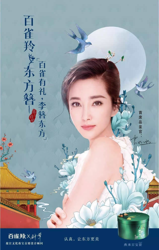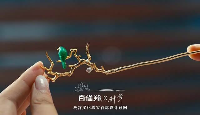 百雀羚首席品鉴官李冰冰更是佩戴东方簪,品鉴由百雀羚和钟华共同打造的这份东方美。