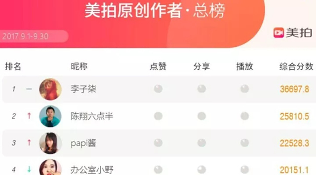 美拍是典型的粉丝导向型的榜单,点赞,分享和播放初期完全依赖于累计粉丝,然后才会被推荐到热门频道获取更多的点赞、分享和播放量。