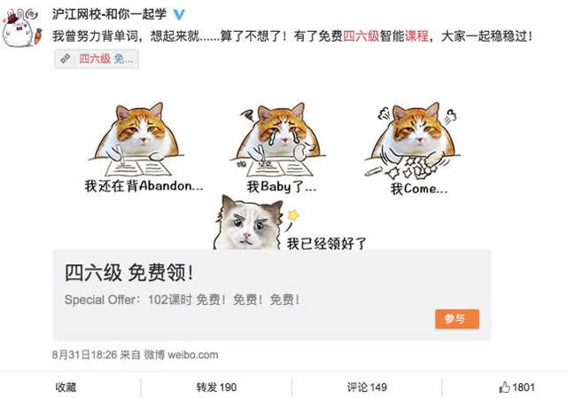 有心的朋友还可以对比下,现在去搜“四六级成绩”结果会与图中完全不一样。限于篇幅,想了解详细操作的,可以加我微信单独沟通。 日常运营之:别把微博当课堂 大学的生活除了上课考试,还可以更加丰富多少。在日常内容运营上也可以增加大学生活化内容的运营,一方面活跃气氛带节奏,更重要的是曾倩粉丝的粘性。这也是我们所一直倡导的,要让粉丝“有利”“有益”“有趣”,有利指的是,让粉丝能够通过付费满足自己的需求。有益,是指粉丝通过日常的内容阅读也能够增长知识。有趣,就不必多说了,日常发布一些有奖活动、节日活动、来个互动吐槽话题等等。