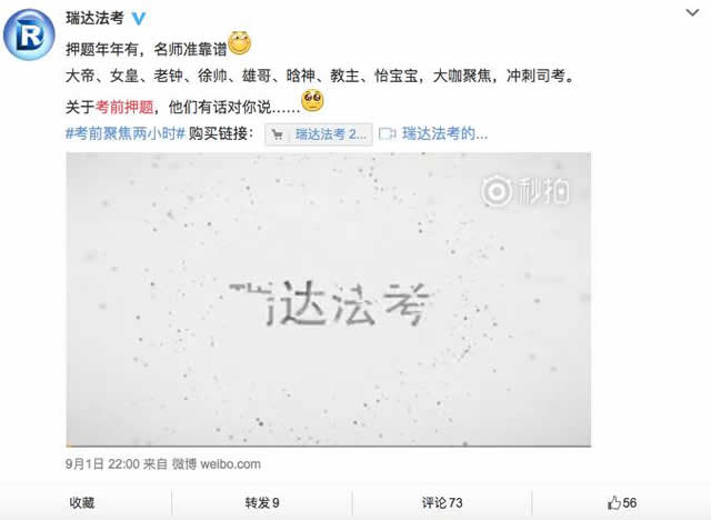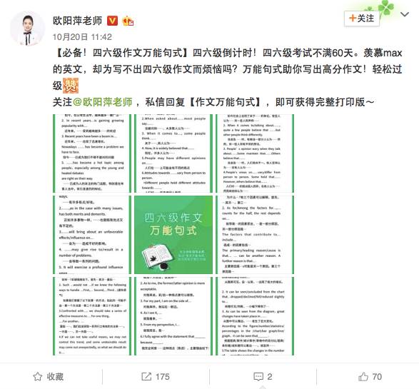 【经验1】学习干货资料,以九图为主,内容背景同一,视觉效果较好,中间图体现品牌特性和内容主题。 【经验2】博文中带入加关注的引导,同时引导粉丝关注后私信领取专业且免费的学习资料,而这些资料对于学生人群是刚需。 【经验3】非时事内容,可以考虑下午或晚上发出,待已有粉丝互动一拨后,次日再来推广。利用用户的从众心理,对于优质内容都会先mark后看的习惯。 考研方面,由于难度和专业性方面强于四六级,所以在干货内容方面【知识梳理】【疑难重点】等知识内容比较受欢迎。 由于考研专业分化比较明显,所以政治和英语这两门通用课程的内容受众面相对较广。前期整体投放的涨粉成本在5~8元左右,高于四六级,处于中上水平。