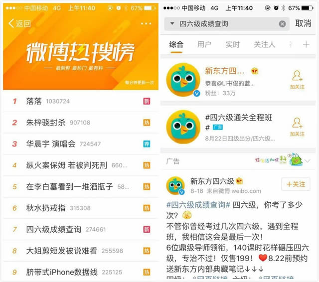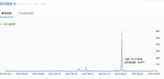 关于节点还有一个大杀器,那就是微博搜索,6月份的时候四六级出成绩,“四六级成绩”这个词上了热搜,当然这个词上热搜不是购买了广告,是广大学生群体自然搜索形成的。从微博的官方数据中心微指数中可以看到,在8.22日当天,“四六级成绩”这个关键词热度飙升!