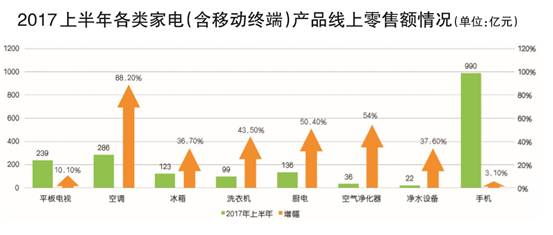 奥维咨询曾在“战后”针对消费者网购大家电做过一项调查,数据显示,89%的中国人接受网购大家电。自此,线下巨头苏宁、国美也开始转向线上,不断加大投入,家电线上市场成为了渠道商和家电企业的拼杀主阵地。家电行业的新业态诞生了,一种生活新方式也出现在了中国消费者的面前。到了今年,根据国家统计局公布的2017年1~6月社会消费品零售总额及各消费类型情况,中国的家电网购渗透率达到了24.8%,远高于其他商品的平均网购渗透率,达到一个新的台阶。