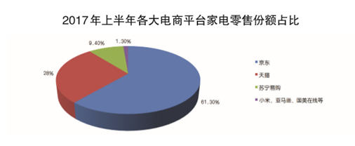 根据中信部赛迪研究院2013-2017年度发布的中国家电网购分析报告显示,宣传片中“中国人的家电网购六成来自京东,连续五年遥遥领先”倒是所言非虚。自2013年起,中国家电网购市场就形成了京东一马当先,天猫、苏宁易购、国美在线竞相追赶的“一极多强”局面,格局相当稳定。2017年上半年,京东的零售份额占比达到了61.3%,地位依旧稳固。