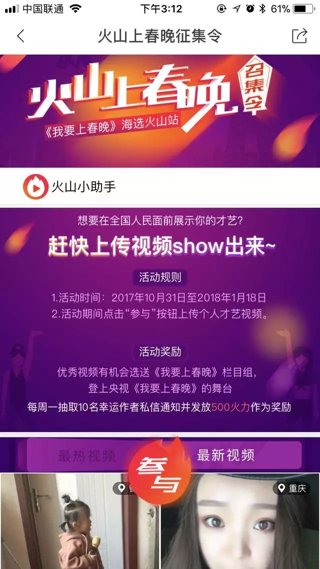 《我要上春晚》在火山小视频的报名专区 作为一个15秒原创生活短视频社区,火山小视频在诞生之初就鼓励用户记录分享生活,创作优质的内容。为此,今年5月,火山官方曾宣布未来一年里将拿出10亿元补贴小视频,每位用户上传的每个小视频,只要符合优质、原创标准,都将获得现金补贴。针对内容特别优质的达人,推出特定养成计划,进行长期流量扶持。 第三方数据机构Trustdata大数据第三季度报告显示,火山小视频用户月活环比增长56%,领跑整个短视频市场。 火山小视频还吸引了众多“身怀绝技”的用户,在平台上可以找到有歌唱、街舞、跑酷、攀岩、魔术等各种绝活的达人,这与《我要上春晚》发掘民间草根明星的主题非常契合。