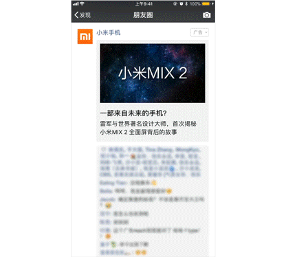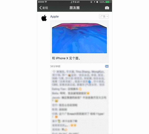 小米朋友圈广告示意 造势阶段,加深产品理解,提升互动 此阶段主要营销活动有新机开售、节日热点营销等,不同于预热阶段的单纯曝光目标,此阶段更重要的是互动。建议品牌选择朋友圈原生推广页广告、公众号互选广告或视频贴片广告等提升互动效果,并使用@广告主互动评论功能,激发社交讨论与互动。同时通过按需定制兴趣人群,例如通过消费者登录机型的变更频率来评估出换手机高潜人群,有效提升消费者互动质量。 苹果公司连续投放苹果iPhone 7 & 苹果iPhone X产品首发视频,精准投放高购买力人群,迅速引发消费者广泛讨论。