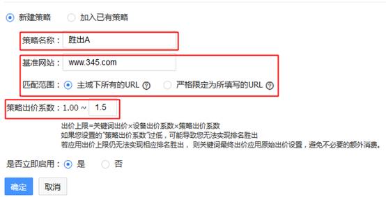 ② 设置策略名称:2-10个汉字,同数字营销与服务账户下不能有相同名字的策 ③ 设置基准网站:填写想超越的网站主域名,长度不超过36位 ④ 设置出价上限:出价上限=关键词出价*设备出价系数*策略出价系数 例:关键词出价为2元;设备出价系数为1.2;策略出价系数为1.5 出价上限=2*1.2*1.5=3.6元