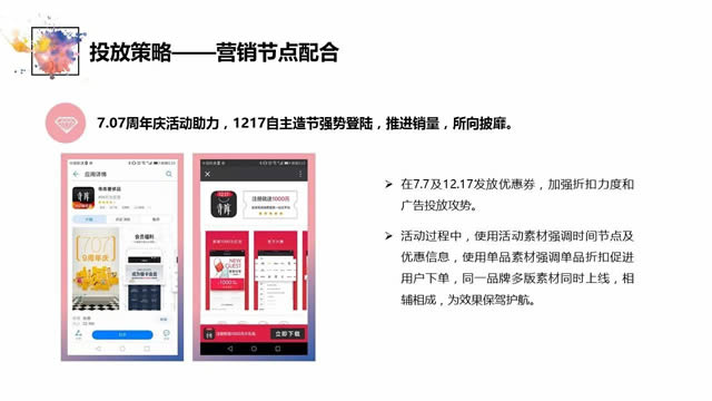 根据麦肯锡发布的中国奢侈品消费者报告,2016年有760万户中国家庭购买了奢侈品,家庭年均奢侈品消费达7.1万元人民币。预计到2025年,全球奢侈品市值将增加1万亿元人民币,达到2.7万亿元人民币,中国消费者将“买下”44%的奢侈品全球市场。面对国内潜力巨大的奢侈品市场和参差不齐的电商竞争,寺库该如何冲出重围,做“高端生活服务平台第一股”? 营销节点 助力造势 借助7.07周年庆和1217自主造节两个营销节点,寺库强势登陆,推进销量,所向披靡。 在7.7及12.17发放优惠券,加强折扣力度和广告投放攻势。活动过程中,使用活动素材强调时间节点及优惠信息,使用单品素材强调单品折扣促进用户下单,同一品牌多版素材同时上线,相辅相成,为效果保驾护航。