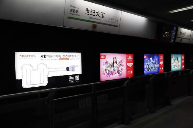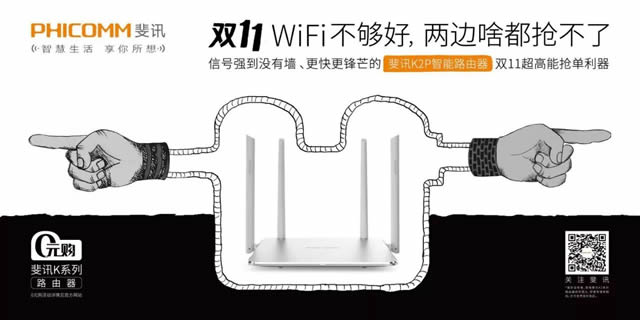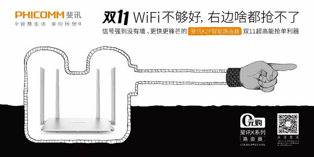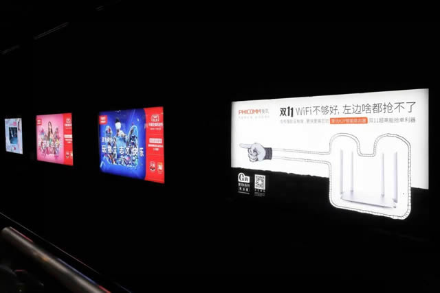 双11WIFI不够好,右边啥都抢不了 这个斐讯品牌广告紧挨着天猫的广告,文案是“双11wifi不够好,左边啥都抢不了”让人看了不禁会心一笑,这还没完,没走两步该品牌又在两边都是双11灯箱广告的中间位置插入品牌海报,并搭配文案:双11wifi不够好,两边啥都抢不了。
