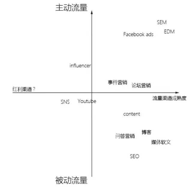 从此书的关键词也可看出,流量的玩法总结来说就是向不同渠道要流量,SEO SEM是向搜索引擎要流量,博客软文是向网站要流量,EDM问邮件系统要流量,SNS向社交媒体要流量。而营销人员要做的,就是找到正确的渠道,用正确的方法,要来符合ROI的流量。 流量渠道可以从两个属性划分,一个是渠道成熟度,新的渠道往往会有红利期,而老的渠道竞争激烈,需要更好的方法技巧,甚至已经衰落,不值得花多少精力。 另一个点看是被动流量还是主动流量,主动流量如广告投放立竿见影,但成本较高,被动流量典型如软文SEO,需要日积月累积少成多。 大概做了个示意图,不严谨,只是展示下这个框架。